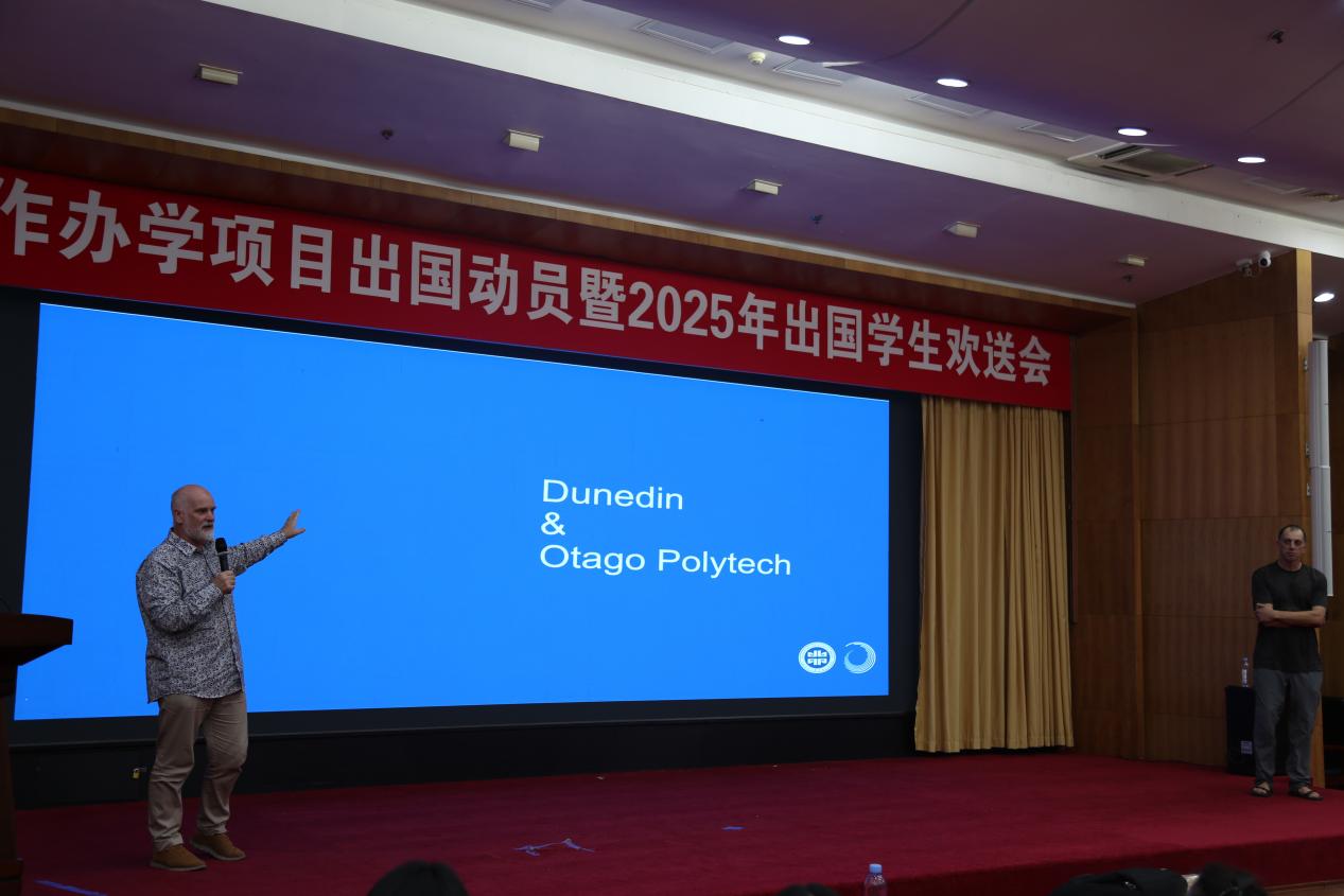 6月18日,中新合作学院在图书馆报告厅举办中新合作办学项目出国动员暨2025年出国学生欢送会。奥塔哥理工学院教师Richard、Adam、学院领导班子及全体教职工、2022级出国学生、2023和2024级全体学生参加会议,会议由学院党总支副书记沙雷主持。